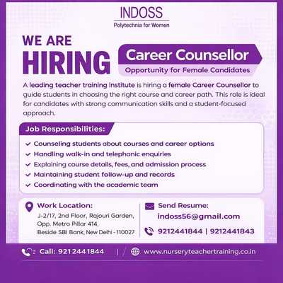 A leading teacher training institute is hiring a female Career Counsellor to guide students in choosing the right course and career path. This role is ideal for candidates with strong communication skills and a student-focused approach. Job Responsibilities: Counseling students about courses and career options Handling walk-in and telephonic inquiries Explaining course details, fees, and admission process Maintaining student follow-up and records Coordinating with the academic team Eligibility Criteria: Graduate / Post Graduate preferred Good communication and counselling skills Basic computer knowledge required Freshers with confidence & experienced candidates can apply Positive attitude and professional behavior Work Location: J-2/17, 2nd Floor, Rajouri Garden, Opp. Metro Pillar 414, Beside SBI Bank, New Delhi – 110027